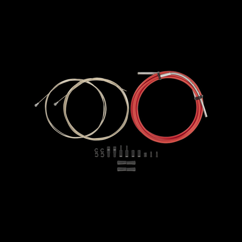 All parts needed for a complete brake cable and housing install are included. Kits contain extra-long inner cables and ample housing for large frames with continuous housing runs or mechanical disc brakes. Pro Brake kits are available in 10 colors and finishes. Black kits contain gloss black housing with silver logos; Stealth Black kits have matte black housing featuring black logos.