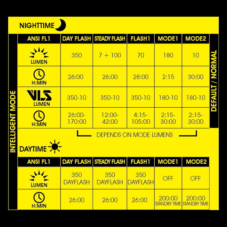 - 5 modes: DAY FLASH / STEADY FLASH / FLASH 1 / MODE 1 / MODE 2