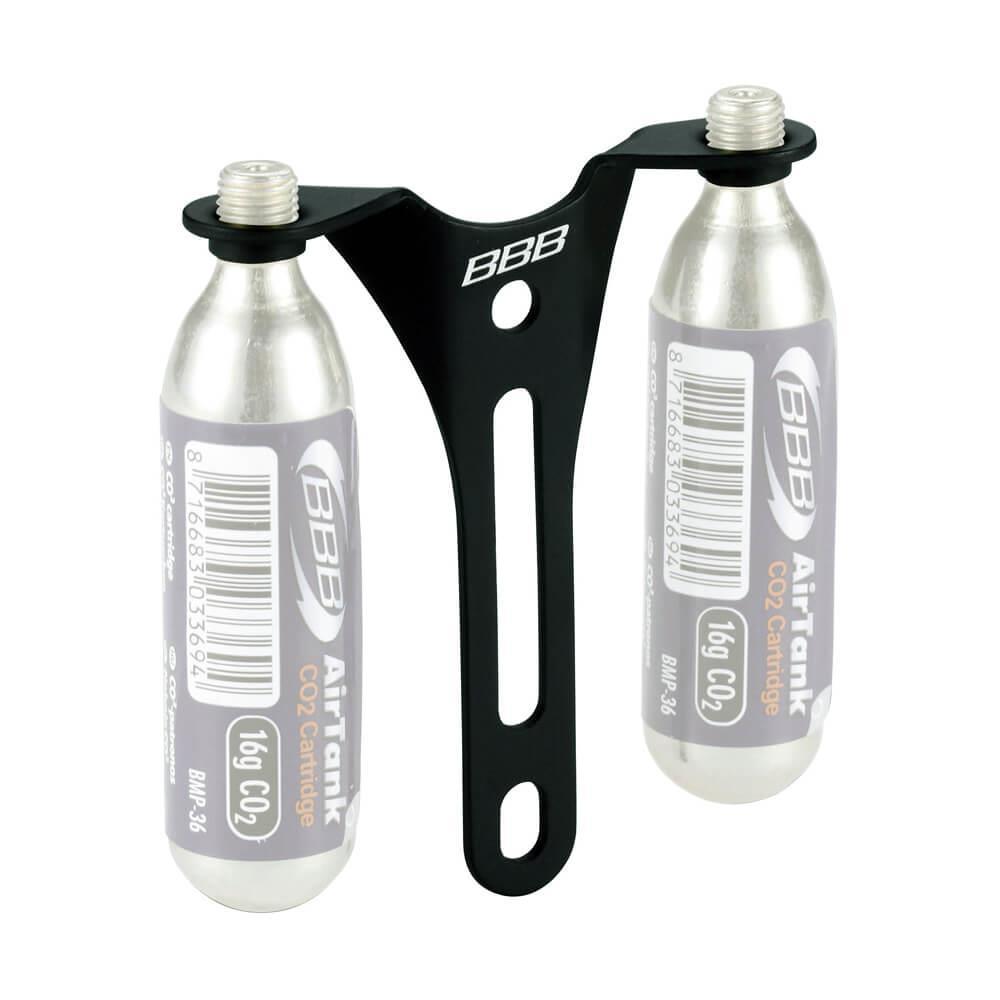 Under bottle cage mounting bracket to securely hold two CO2 cartridges so they are safe and within easy reach.