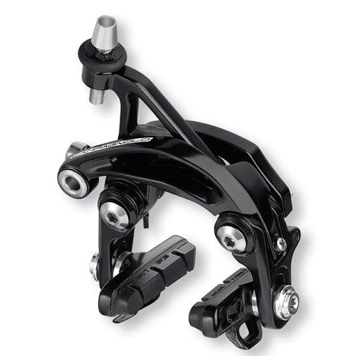 Campagnolo is dedicated towards offering the best performance solution possible no matter what frame a road racing athlete chooses to ride or the tire he or she chooses to mount. As framebuilders begin to develop frame and fork designs that take advantage of the aerodynamic gains represented by direct mount brakes the Campy Tech Lab set forth to produce a pair of direct mount brakes that boast Campagnolo quality and performance standards.This completely new braking system from Campagnolo allows for a completely symmetric and efficient brake application thanks to its self-balancing design. Campagnolo Direct Mount brakes offer surefooted stopping power thanks to their extremely stiff structure while design elements that take inspiration from the traditional skeleton brake design keep weight to a minimum. In addition to pure performance a great deal of attention was paid to ease of use and adjustment. The direct mount brake is often complex to install and adjust and great strides were made to make this Campagnolo version the most user friendly and simple to adjust of any model available.