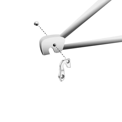 Union replacement rear derailleur hanger manufactured from aircraft grade aluminium by Marwi to the same specification as your original hanger. Used on various brands including Kettler, KHS, GT. Images show both sides of this hanger for reference. Includes an M8 threaded fixing bolt.