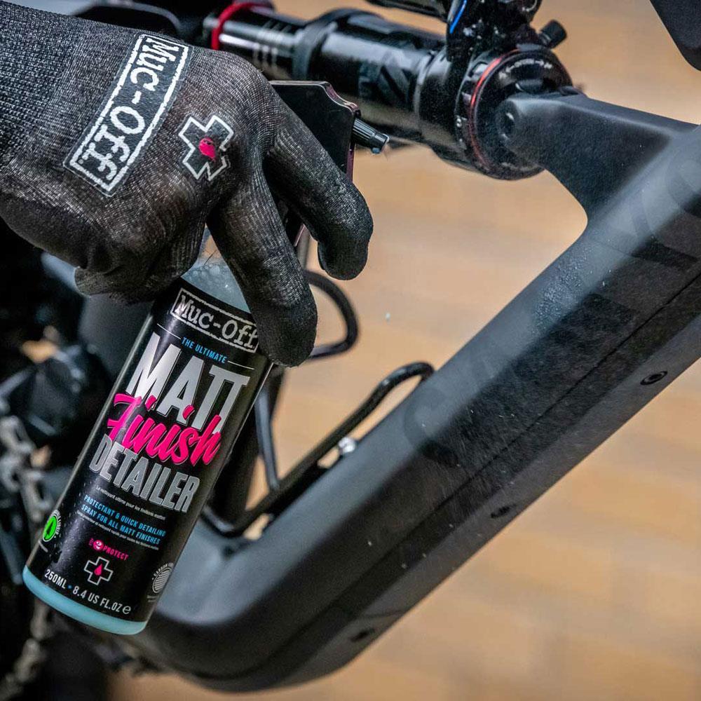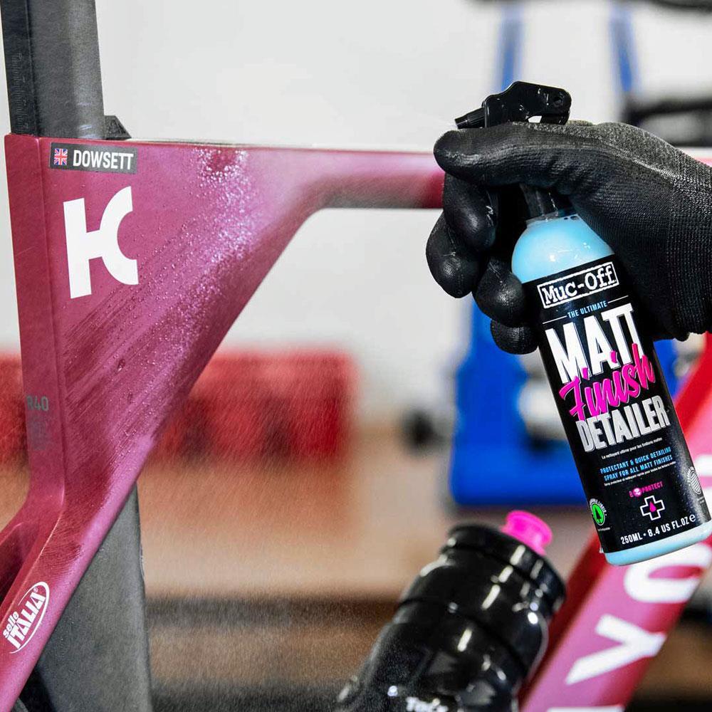 Once you've gotten your bike sparkling clean using our famous pink bike cleaner, just apply a coat of Matt Detailer and wipe with a microfibre cloth. Don't forget to mask any braking surfaces and tyre threads before application!