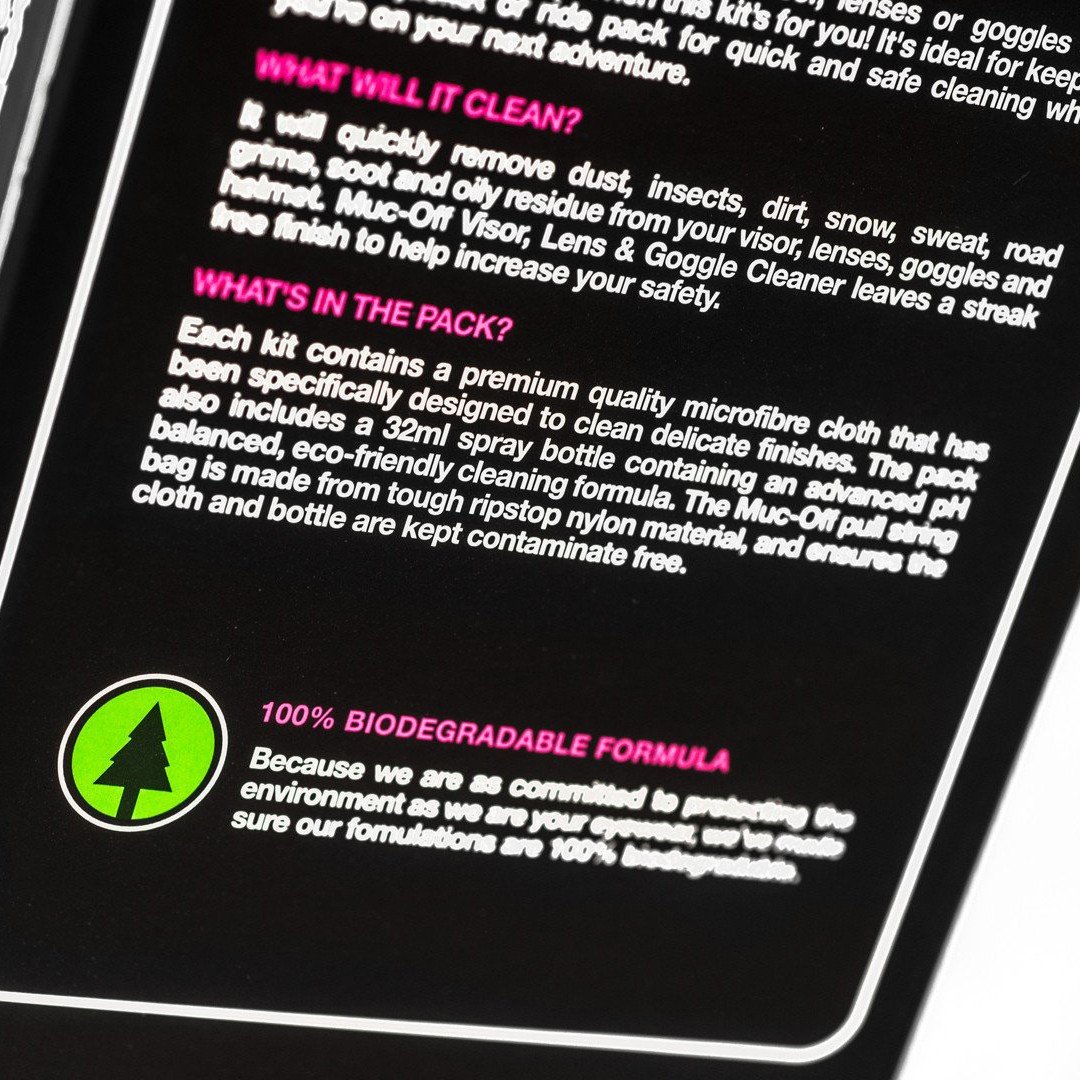 The Visor, Lens and Goggle cleaning Kit is ideal for keeping in your ride pack for quick and safe cleaning on the move. It quickly removes dust, mud, insects, soot and oily residue from your helmet and goggles leaving a streak free finish.