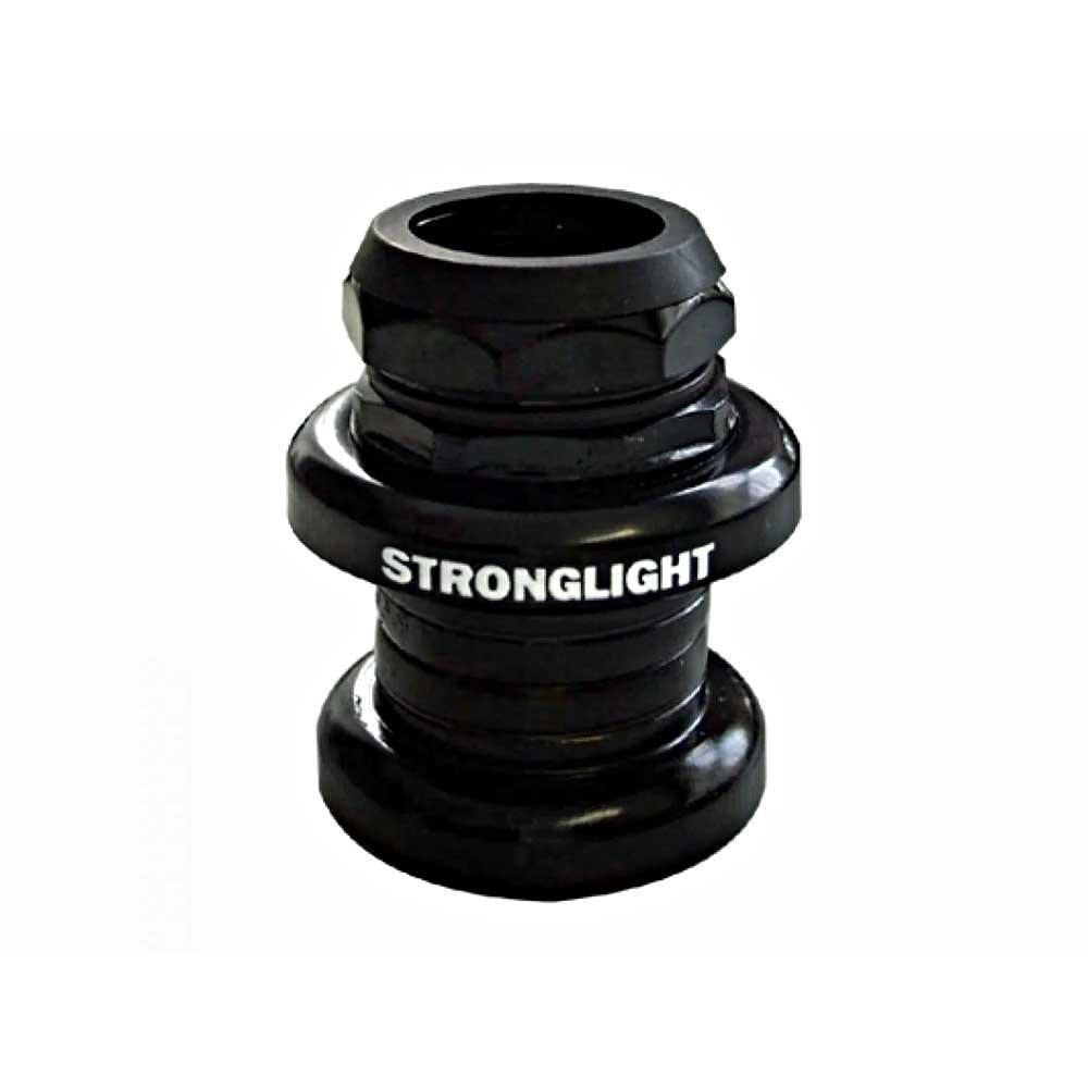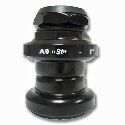 Classic Stronglight A9 1" (English) threaded external cup headset. Gloss black finish with modern long life sealed cartridge bearings. Made in France from high quality steel with "STRONGLIGHT" printed on the upper cup for that perfect retro look. A timeless choice for classic steel frames and vintage restoration projects.