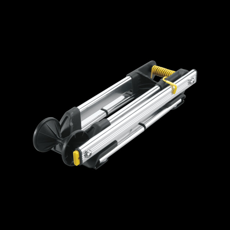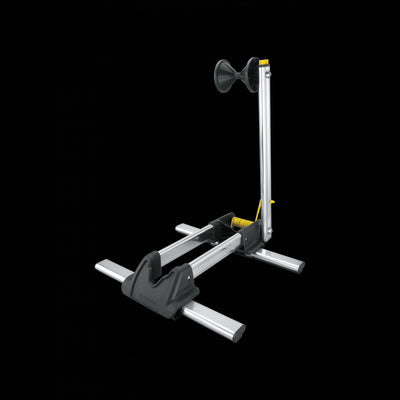 Compact, folding stand for storing or displaying bikes. A spring loaded arm holds front or rear wheel securely.