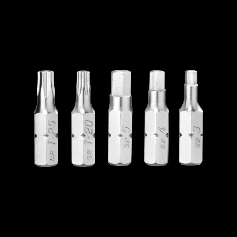 - 3,4,5mm Allen bits & T20, T25 torx bits included