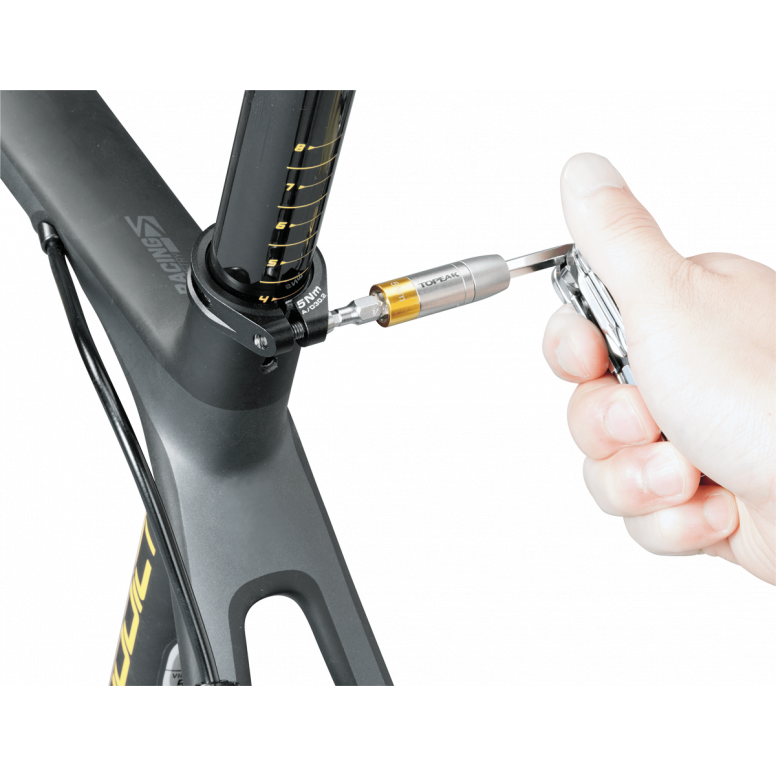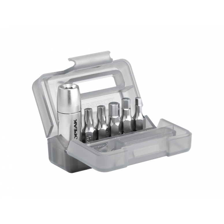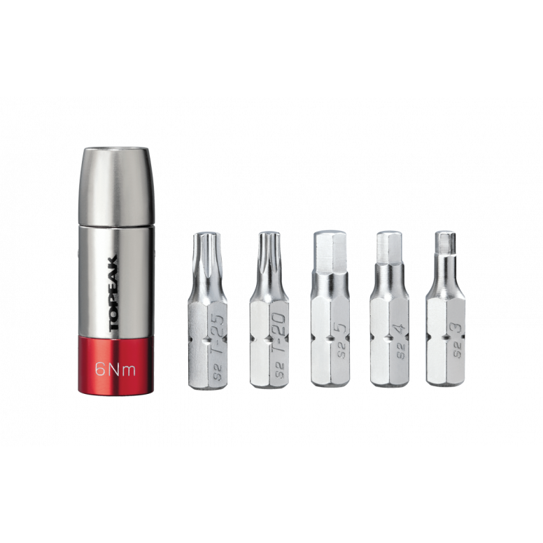 This preset torque socket (4Nm/5Nm/6Nm) kit will work with any mini tool containing a 5mm Allen wrench (or single 5mm Allen wrench) to apply correct torque values on component bolts for safety and to prevent damage to expensive carbon parts. A carry case neatly stores one preset 4 Nm (5Nm or 6Nm) and the 5 most popular tool bits (3/4/5mm hex & T20/T25 Torx).