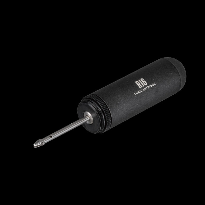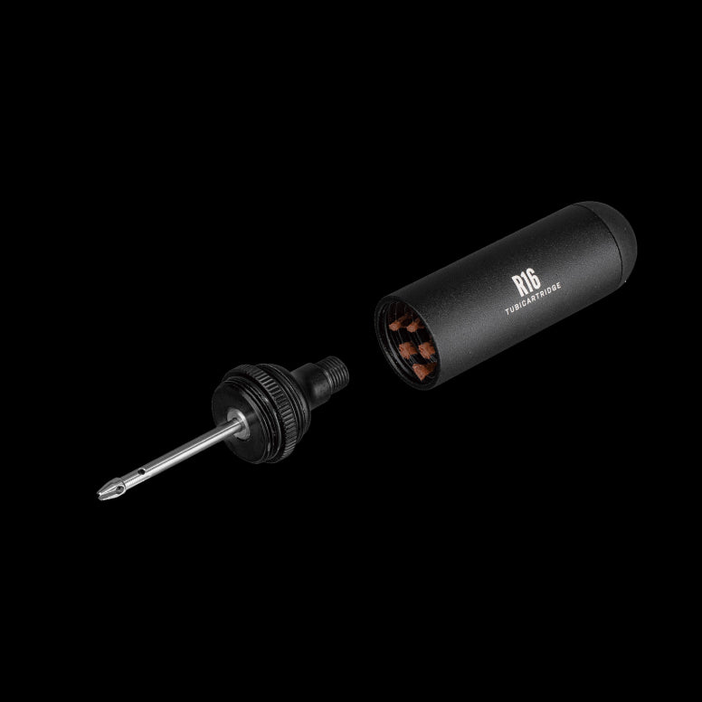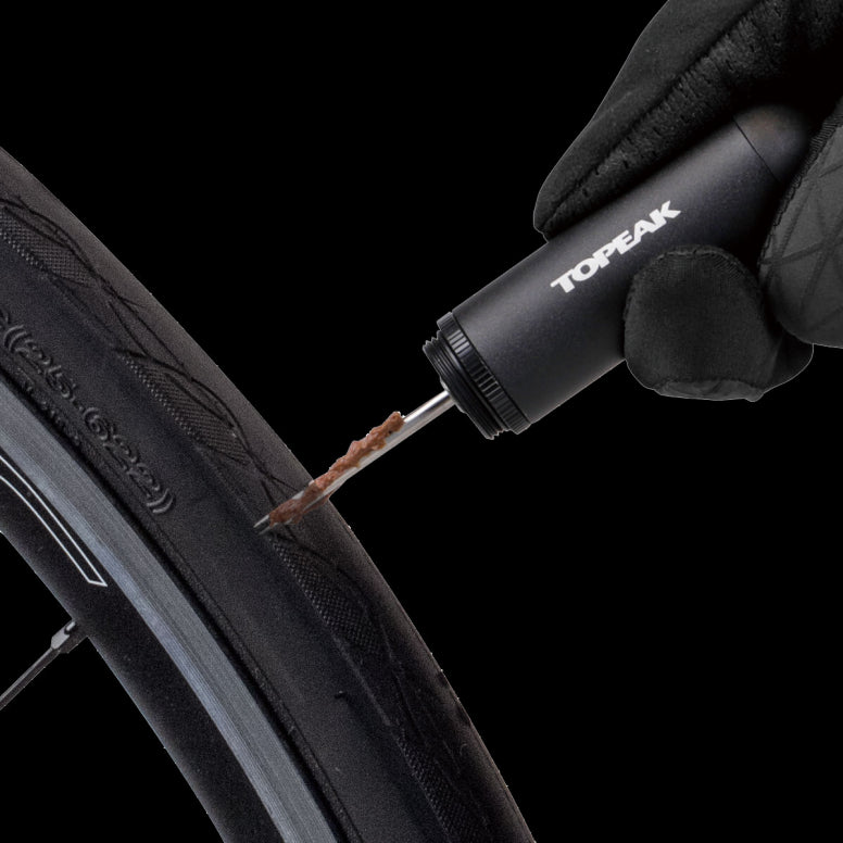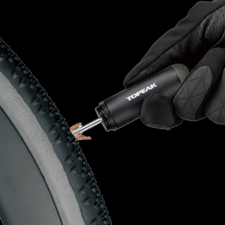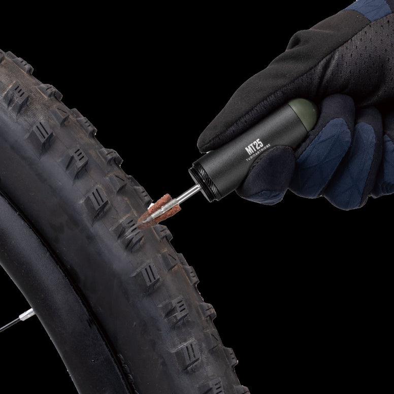 A Tubeless tyre repair kit stored compactly in a CO2 cartridge style pod used alone for tyre repairs or additionally with CO2 inflator for tyre inflation. Mount to saddle rails or bike frame with HybridMaster Mini, TubiMaster GX DF, NanoMaster DF, or TubiMaster GXT Bolt-on for a complete tubeless tyre repair and/or inflation solution.