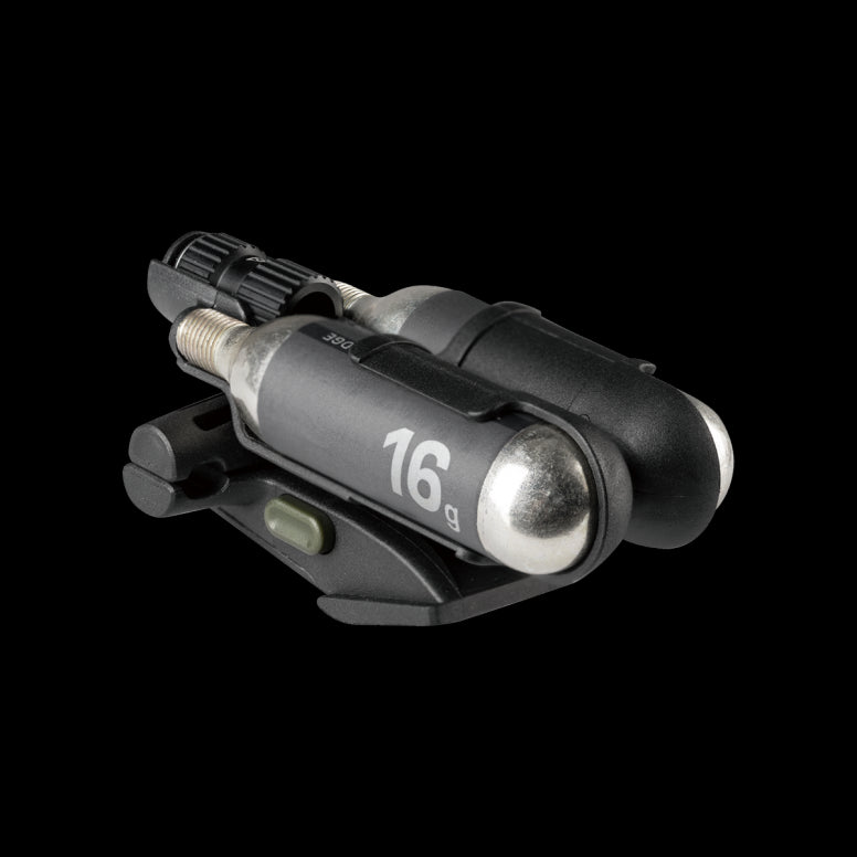 Ultra compact CO2 inflation kit featuring a Nano AirBooster CO2 inflator and two 16g CO2 cartridges. Mounts to saddle rail with included Duo Fixer which provides dual use with Topeak Duo Fixer system accessories.